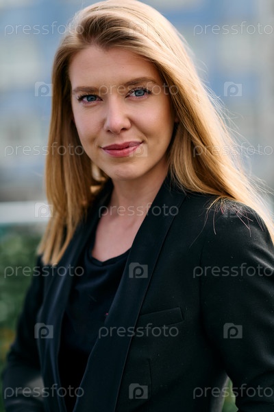 Портрет стильной деловой блондинки, позирующей на террасе в городском пейзаже