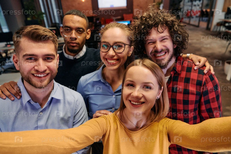 Группа разнообразных профессионалов в сфере бизнеса отдыхает от своих задач в современном офисе стартапа, чтобы сделать креативное селфи, демонстрируя командную работу и яркую корпоративную культуру