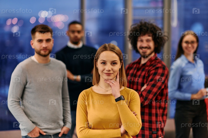 Портрет успешной творческой бизнес-команды, смотрящей в камеру и улыбающейся. Разнообразные деловые люди, стоящие вместе на старте. Избирательный фокус