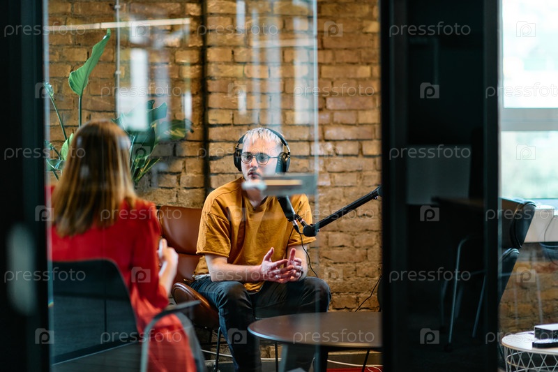 Группа молодых профессионалов бизнеса, некоторые из которых сидят в офисе со стеклянными стенами, ведут оживленную беседу и записывают онлайн-подкаст, воплощающий современное сотрудничество и динамическое взаимодействие