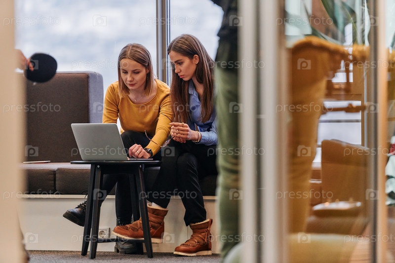 Коллеги по бизнесу проверяют работу на ноутбуке во время перерыва