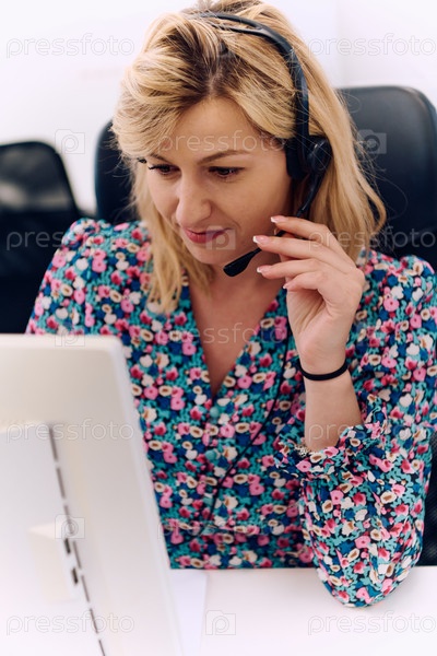 Дружелюбный агент колл-центра отвечает на входящие звонки с помощью гарнитуры и обеспечивает удаленное обслуживание клиентов