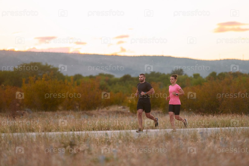 Пара в спортивной одежде бежит по живописной дороге во время утренней тренировки, наслаждаясь свежим воздухом и поддерживая здоровый образ жизни