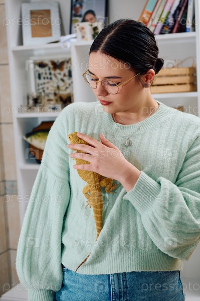 Красивая женщина позирует со своими очаровательными питомцами — бородатыми агамами