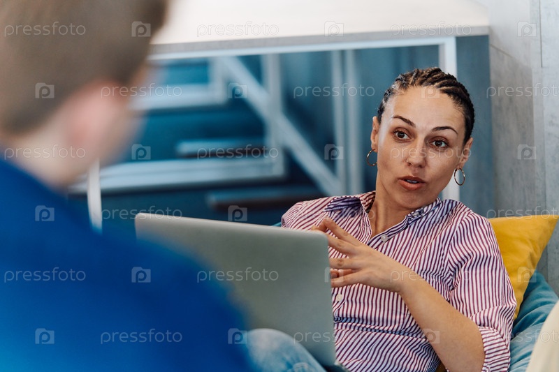 Современный программист обсуждает будущие бизнес-проекты с коллегами в современном офисе стартапа