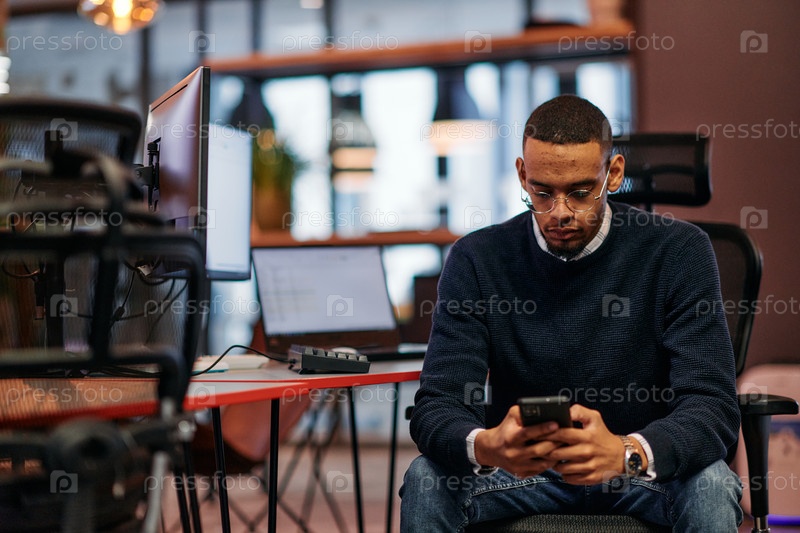 Размышления после работы: афроамериканец использует смартфон в офисе