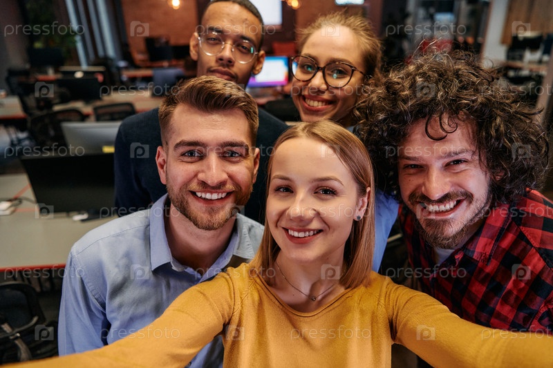 Группа разнообразных профессионалов в сфере бизнеса отдыхает от своих задач в современном офисе стартапа, чтобы сделать креативное селфи, демонстрируя командную работу и яркую корпоративную культуру