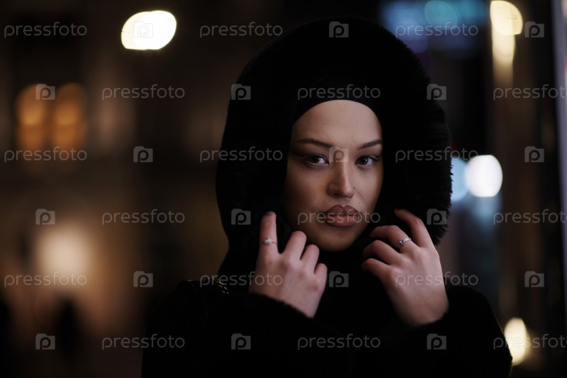 Мусульманка идет по городской улице холодной зимней ночью в хиджабе