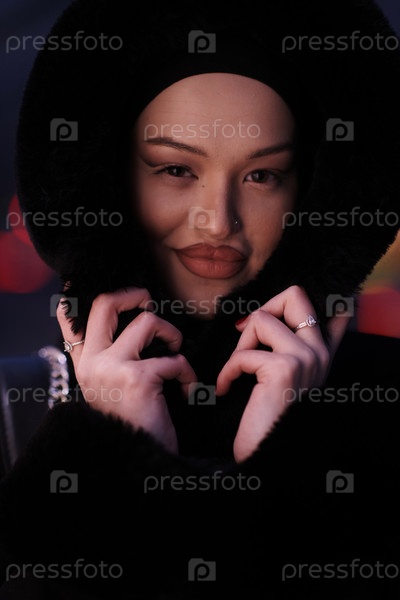 Мусульманка идет по городской улице холодной зимней ночью в хиджабе