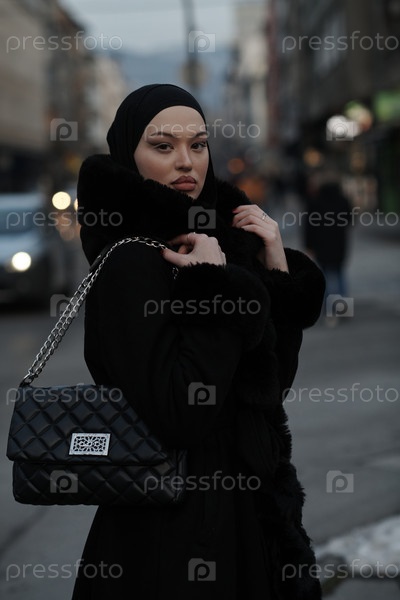 Мусульманка идет по городской улице холодной зимней ночью в хиджабе