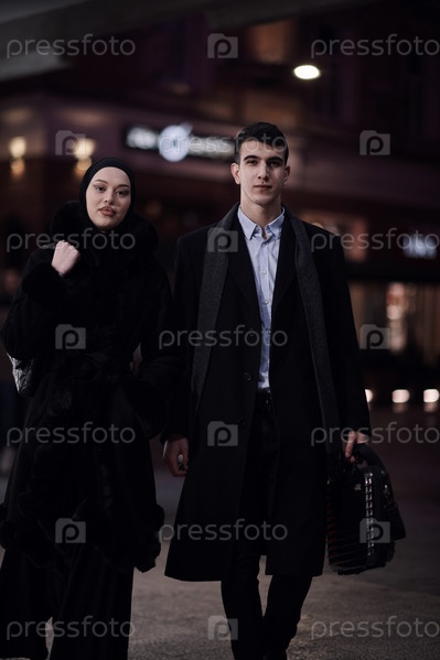 Счастливая мультикультурная деловая пара прогуливается вместе на улице города ночью возле витрины ювелирного магазина