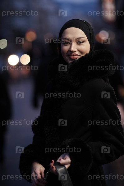 Мусульманка идет по городской улице холодной зимней ночью в хиджабе