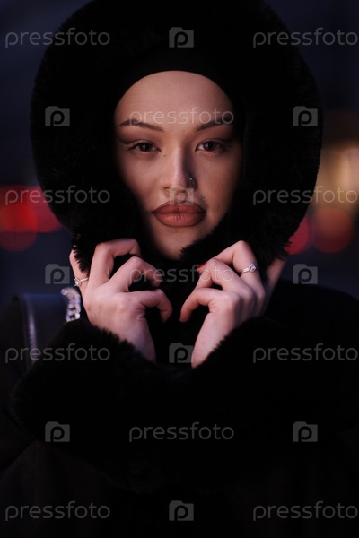 Мусульманка идет по городской улице холодной зимней ночью в хиджабе