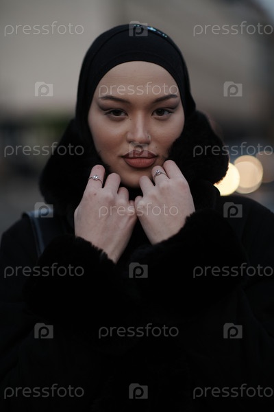 Мусульманка идет по городской улице холодной зимней ночью в хиджабе