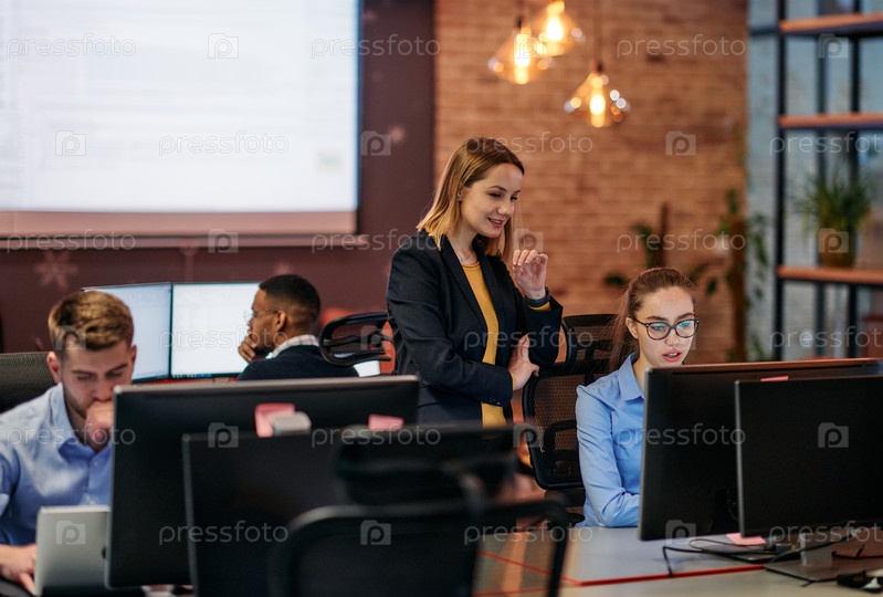 Стратегическая бизнес-встреча: группа профессионалов, работающих в офисе с использованием компьютеров