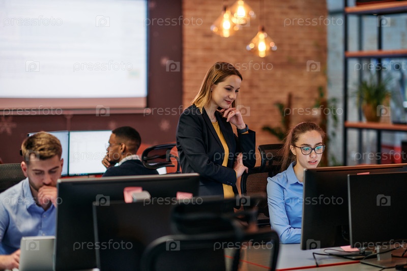 Стратегическая бизнес-встреча: группа профессионалов, работающих в офисе с использованием компьютеров