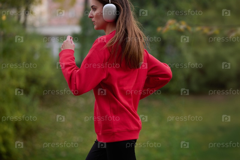 Молодая красивая женщина бежит в осеннем парке и слушает музыку в наушниках на смартфоне
