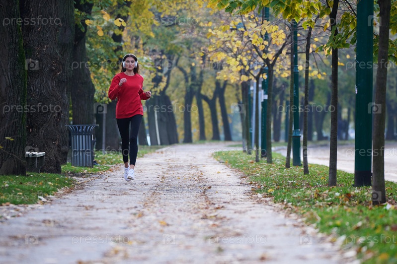 Молодая красивая женщина бежит в осеннем парке и слушает музыку в наушниках на смартфоне