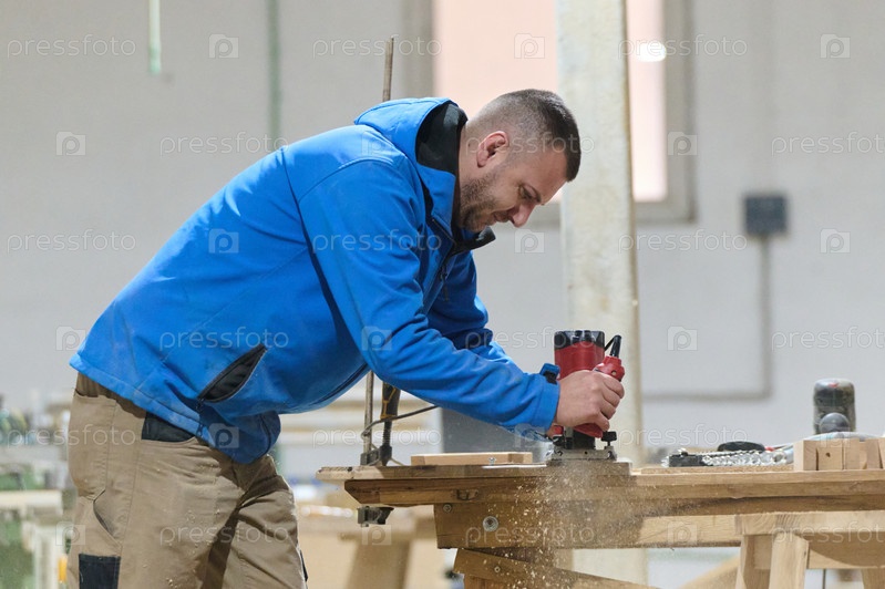 Крупный план рабочего, аккуратно режущего и строгающего деревянные детали для мебели в деревообрабатывающей промышленности