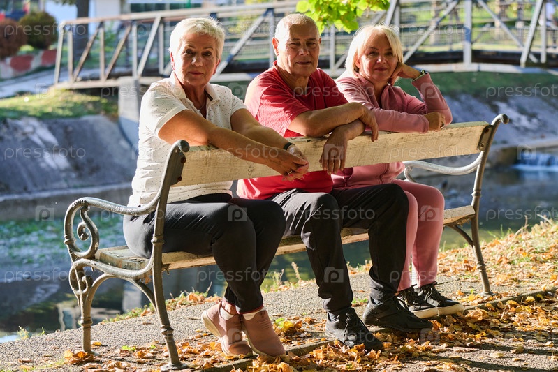 Группа пожилых людей, включая пожилого мужчину и двух пожилых женщин, сидит в парке в солнечный осенний день, воплощая концепцию здорового старения через общение, отдых и активный отдых на свежем воздухе
