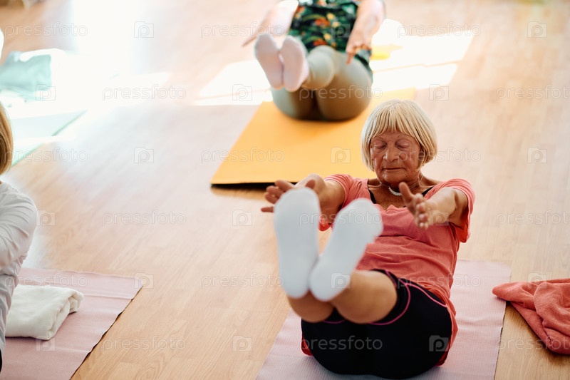 Группа пожилых женщин занимается различными упражнениями йоги, включая растяжку шеи, спины и ног, под руководством тренера в залитом солнцем месте, способствуя благополучию и гармонии