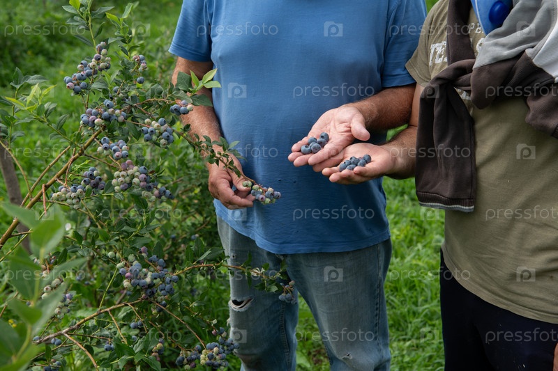 Отец и сын, фермеры, вместе проверяют качество урожая черники