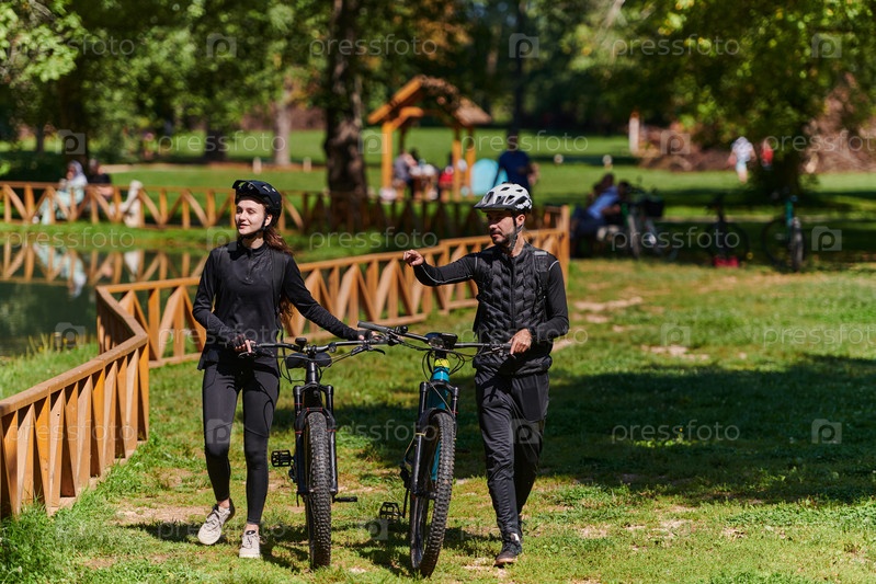 Счастливая пара, одетая в профессиональную велосипедную экипировку, наслаждается романтической велопрогулкой по парку, окруженному современными природными достопримечательностями, излучая любовь и счастье