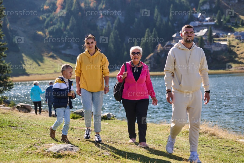 Семья разделяет прекрасные моменты с друзьями на фоне потрясающих пейзажей гор, озер и извилистых троп, пропагандируя здоровый образ жизни и радость семейных уз в объятиях красоты природы