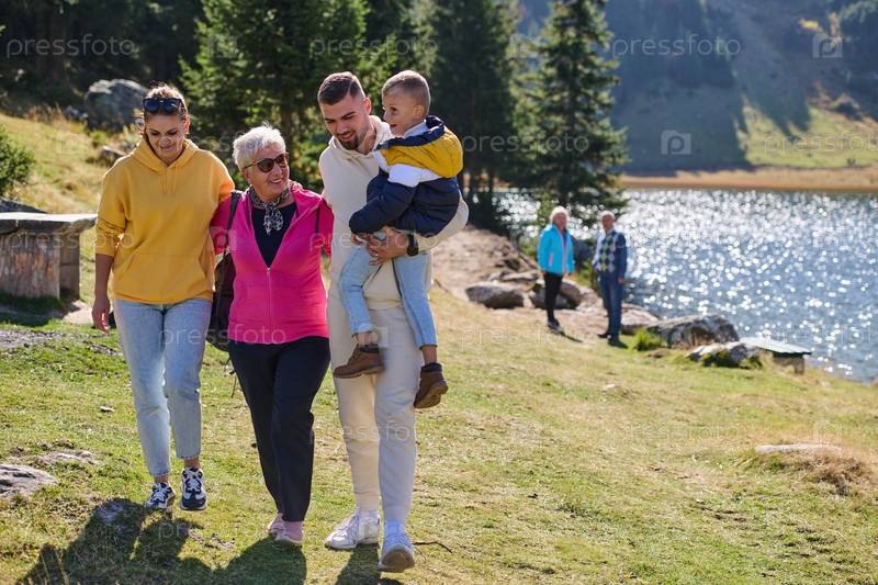 Семья разделяет прекрасные моменты с друзьями на фоне потрясающих пейзажей гор, озер и извилистых троп, пропагандируя здоровый образ жизни и радость семейных уз в объятиях красоты природы