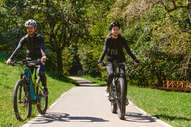 Счастливая пара, одетая в профессиональную велосипедную экипировку, наслаждается романтической велопрогулкой по парку, окруженному современными природными достопримечательностями, излучая любовь и счастье