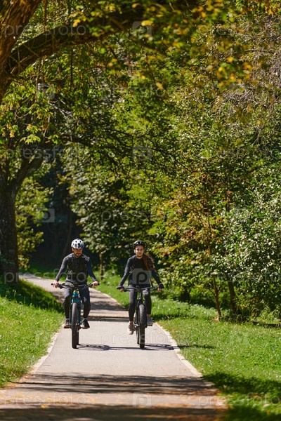 Счастливая пара, одетая в профессиональную велосипедную экипировку, наслаждается романтической велопрогулкой по парку, окруженному современными природными достопримечательностями, излучая любовь и счастье