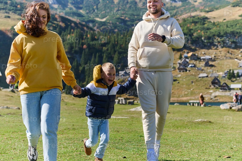 Современная семья вместе со своим сыном наслаждается радостью грязного дня на природе, бегая и играя вместе, воплощая в себе красоту здорового и активного образа жизни