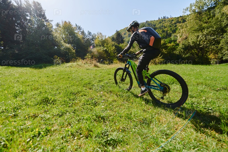 В ярком сиянии солнечного дня любитель фитнеса, одетый в профессиональную экипировку, крутит педали велосипеда по парку, воплощая силу и жизненную силу в динамичной тренировке на открытом воздухе