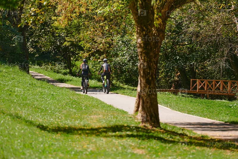 Счастливая пара, одетая в профессиональную велосипедную экипировку, наслаждается романтической велопрогулкой по парку, окруженному современными природными достопримечательностями, излучая любовь и счастье