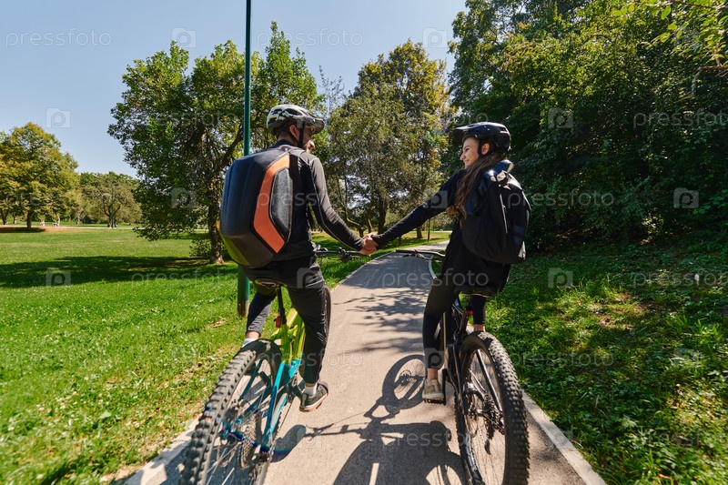 Милая парочка, одетая в велосипедную экипировку, едет на велосипедах, сцепив руки в романтическом объятии, запечатлевая суть любви, приключений и радости на залитой солнцем тропе