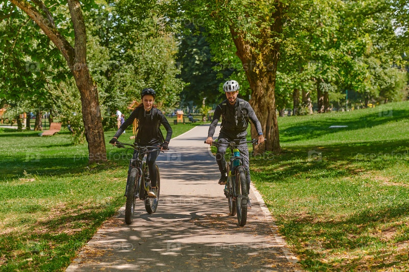 Счастливая пара, одетая в профессиональную велосипедную экипировку, наслаждается романтической велопрогулкой по парку, окруженному современными природными достопримечательностями, излучая любовь и счастье