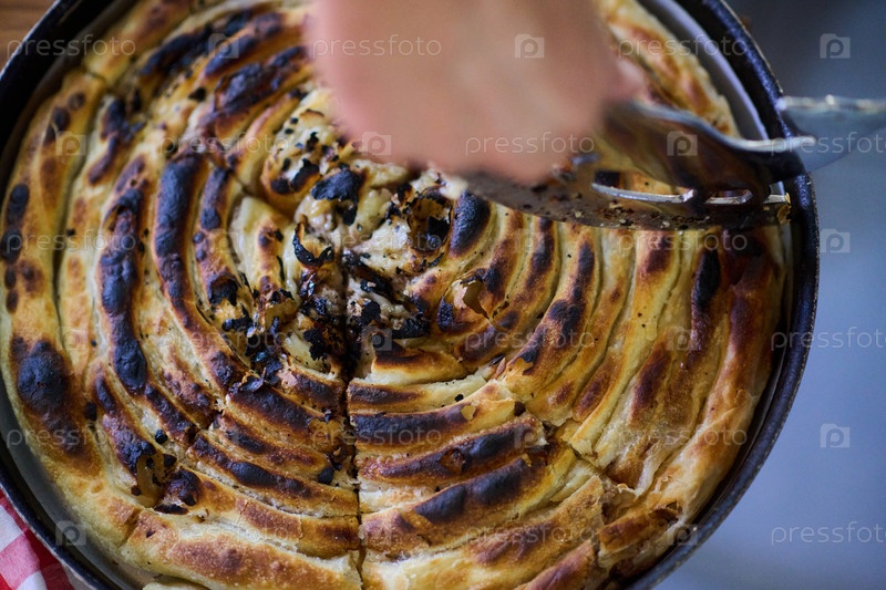 Изысканно приготовленное, это традиционное боснийское блюдо представляет собой аппетитный пирог под своей крышкой, идеально пропеченный и готовый порадовать гостей, воплощая в себе богатое кулинарное наследие и манящие вкусы боснийской кухни