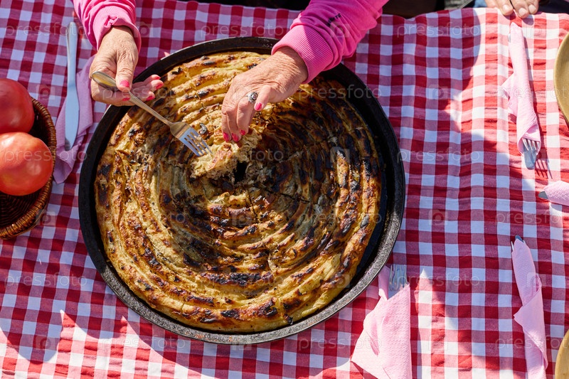 Изысканно приготовленное, это традиционное боснийское блюдо представляет собой аппетитный пирог под своей крышкой, идеально пропеченный и готовый порадовать гостей, воплощая в себе богатое кулинарное наследие и манящие вкусы боснийской кухни