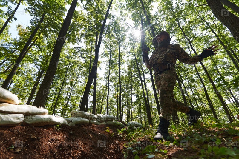 Элитный солдат умело преодолевает военные заграждения в опасной лесистой местности, демонстрируя тактическое мастерство и ловкость во время специализированной подготовки