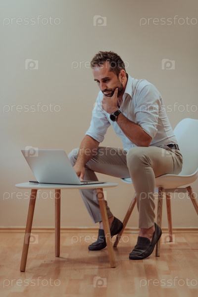 Уверенный в себе бизнесмен сидит и использует ноутбук с решительным выражением лица, а бежевый фон усиливает профессиональную атмосферу, демонстрируя его производительность и опыт