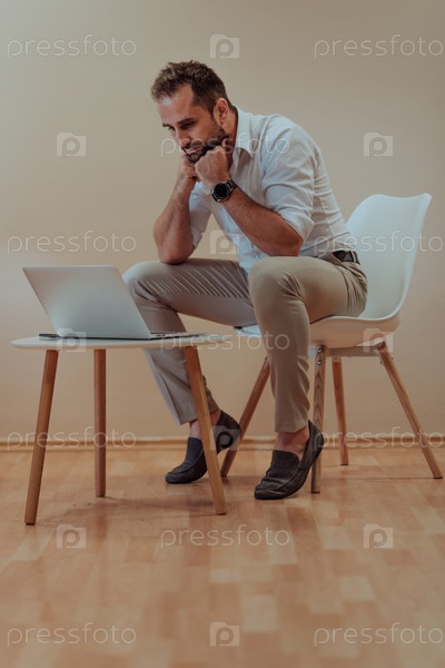 Уверенный в себе бизнесмен сидит и использует ноутбук с решительным выражением лица, а бежевый фон усиливает профессиональную атмосферу, демонстрируя его производительность и опыт