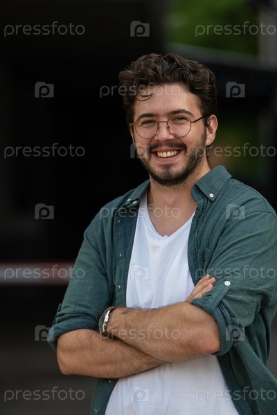 Успешный молодой бизнесмен в рубашке, скрестив руки, позирует на открытом воздухе с уверенным выражением лица