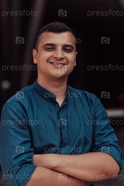 Успешный молодой бизнесмен в рубашке, скрестив руки, позирует на открытом воздухе с уверенным выражением лица