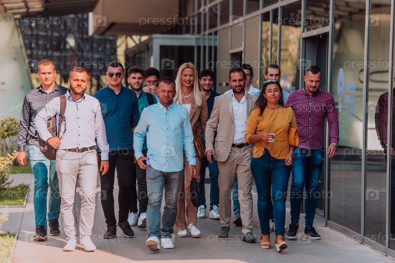 Группа бизнесменов и коллег из разных слоев общества прогуливается по своему рабочему месту, демонстрируя сотрудничество и командную работу в компании