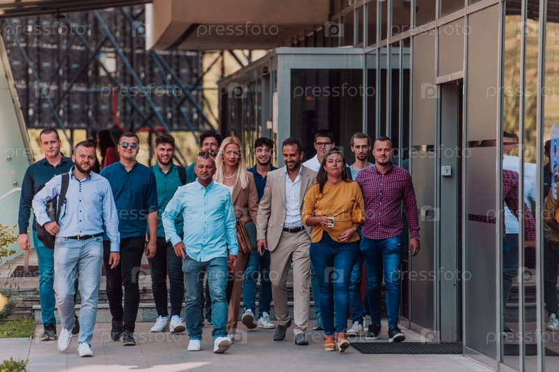 Группа бизнесменов и коллег из разных слоев общества прогуливается по своему рабочему месту, демонстрируя сотрудничество и командную работу в компании
