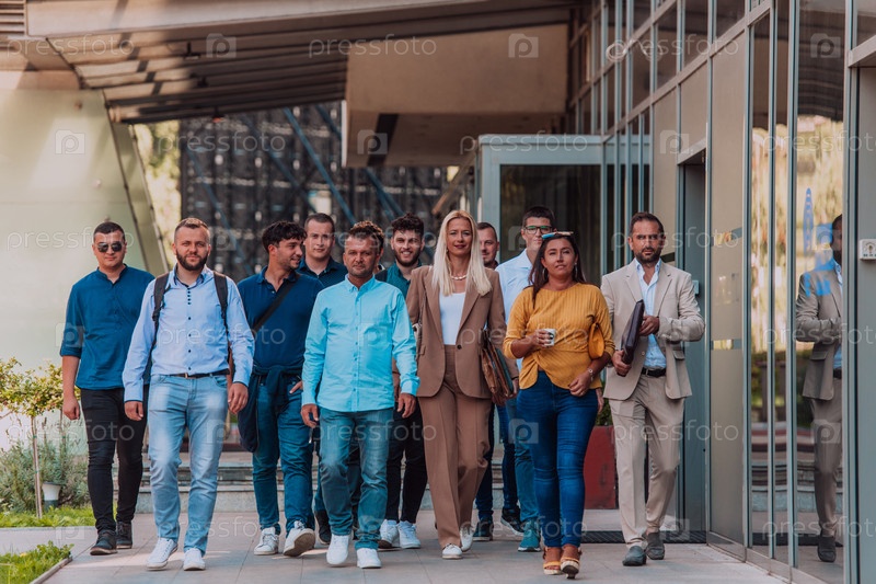 Группа бизнесменов и коллег из разных слоев общества прогуливается по своему рабочему месту, демонстрируя сотрудничество и командную работу в компании
