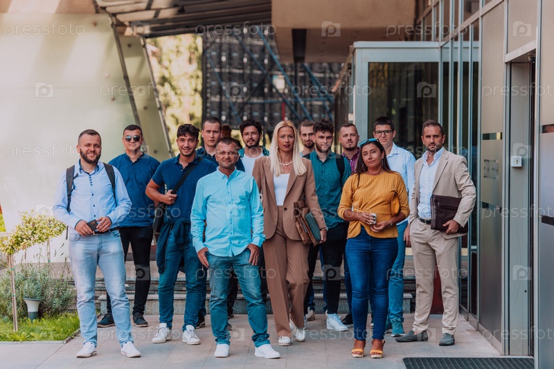Группа бизнесменов и коллег из разных слоев общества прогуливается по своему рабочему месту, демонстрируя сотрудничество и командную работу в компании