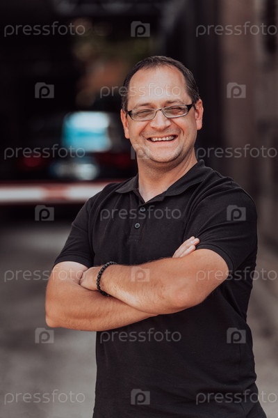 Успешный бизнесмен позирует на открытом воздухе, скрестив руки на груди