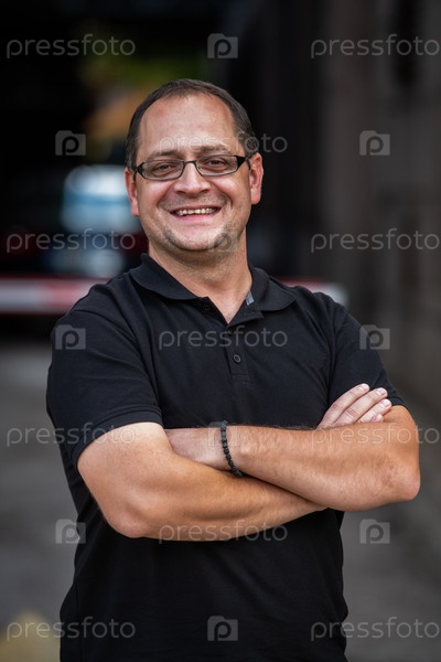 Успешный бизнесмен позирует на открытом воздухе, скрестив руки на груди