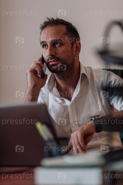 Бизнесмен разговаривает по смартфону, сидя в офисе, демонстрируя свое профессиональное поведение и активное общение